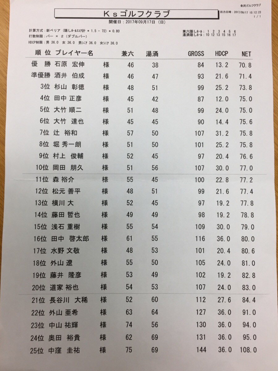 台風の影響で天候が心配されましたね。途中大降りになったものの、後半には雨も上がりプレーを終えることができました。